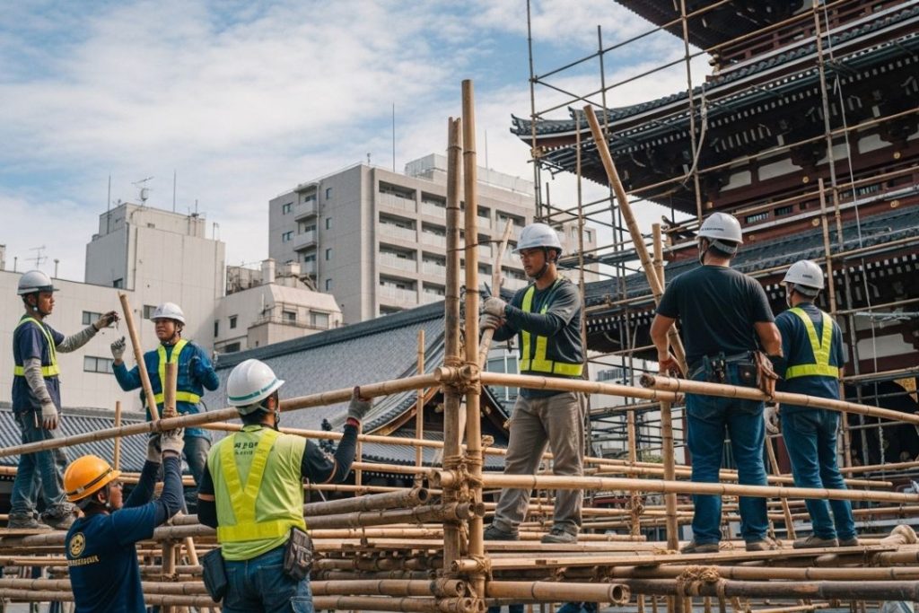 Pekerjaan scaffolding di Jepang meliputi pemasangan, pembongkaran, dan pengamanan perancah konstruksi dengan standar kerja yang presisi, disiplin, dan mengutamakan keselamatan.